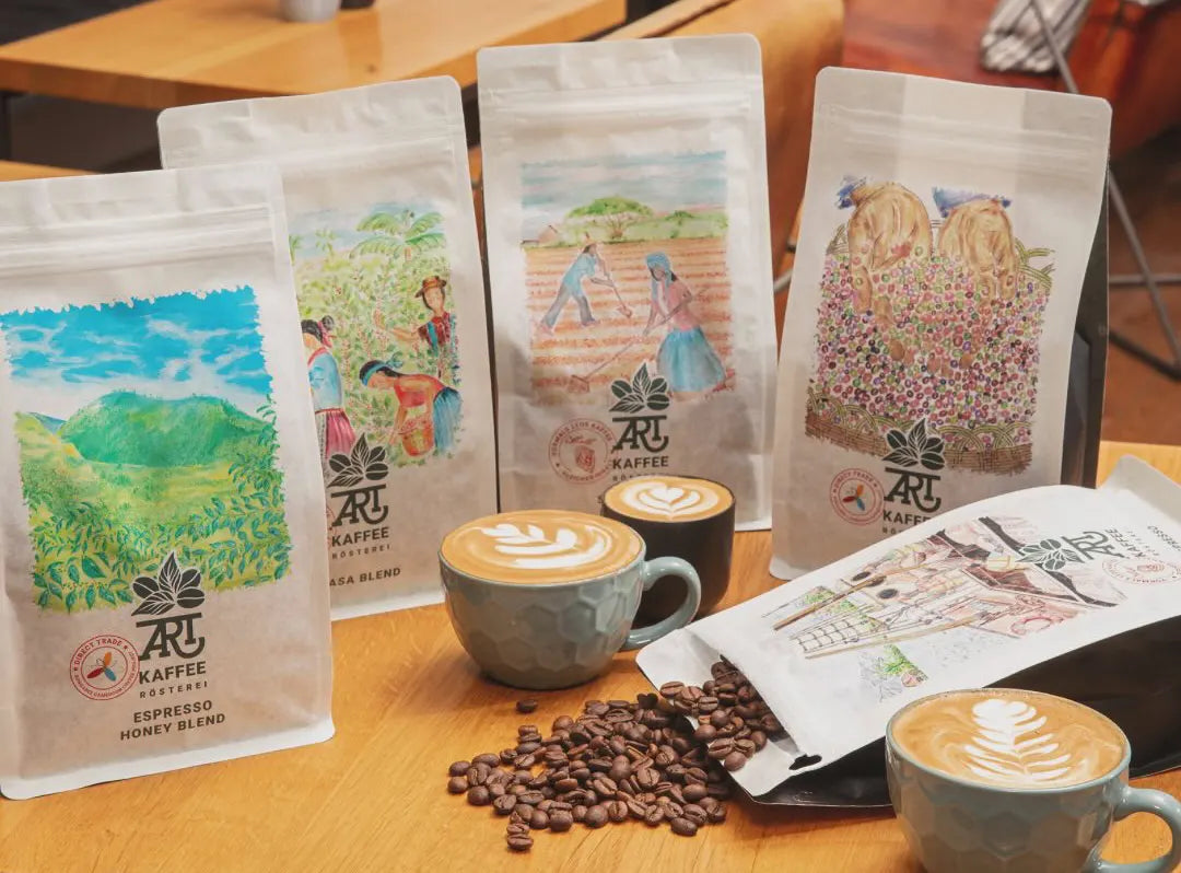 Rebekka hat ihren Vater für die Idee begeistert, die Reise des Kaffees in feinen Zeichnungen darzustellen - von der Kaffeeplantage über die Ernte und Trocknung bis hin zur Verschiffung zum Zielhafen in Deutschland. Diese hübschen Motive werden alle auf einer Staffelei am heimischen Bodensee gemalt und dann auf die Verpackung gedruckt. Weitere Motive sind bereits in Vorbereitung.