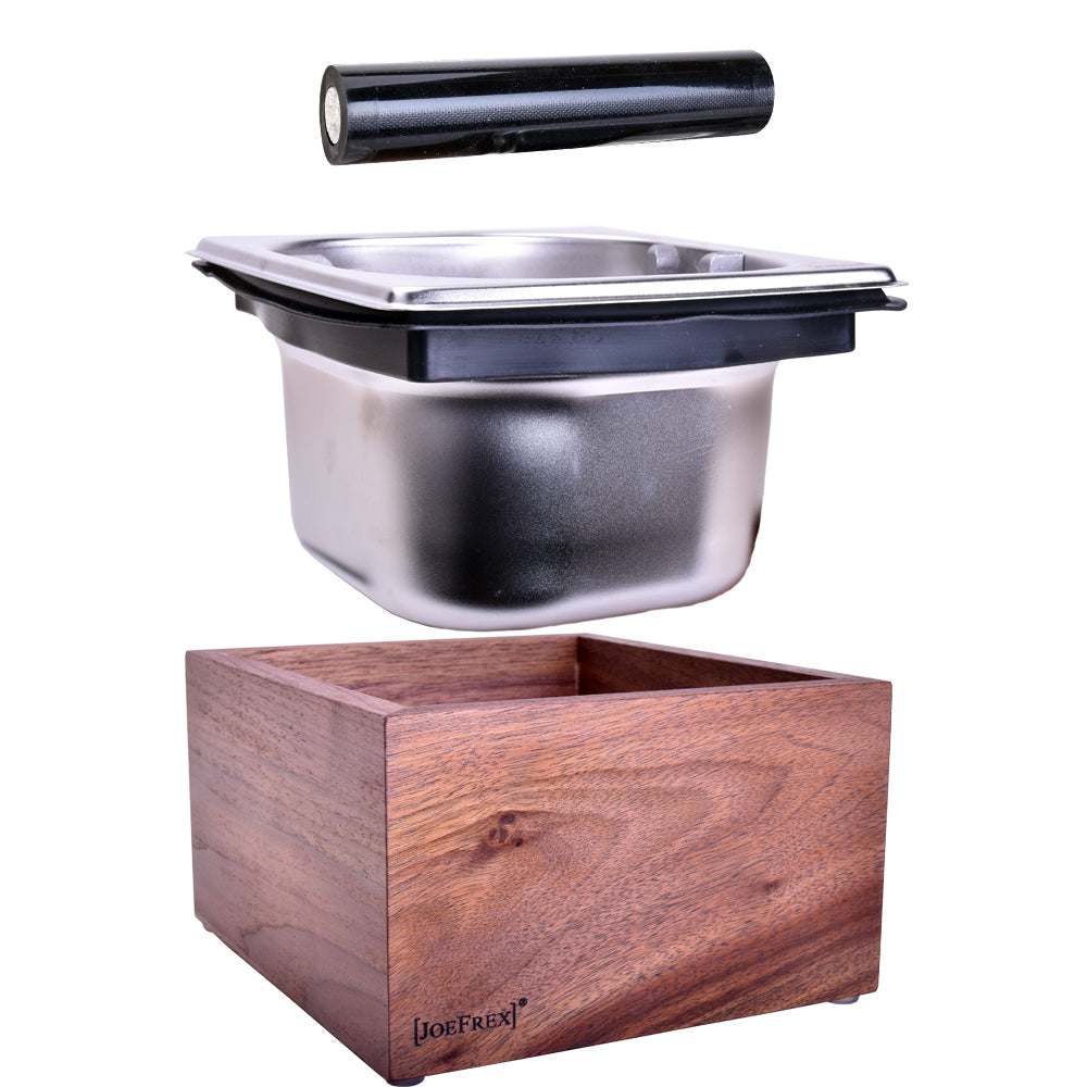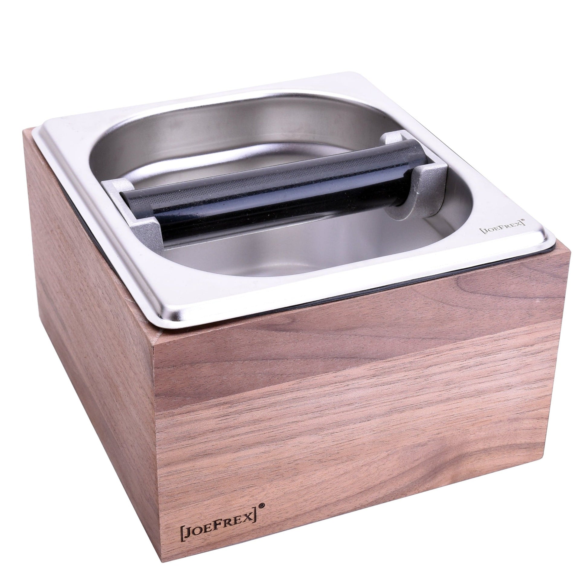 Die JoeFrex Knockbox Nuss ist der ideale Begleiter für alle, die ihre Espresso-Zubereitung sauber und organisiert halten möchten. Sie eignet sich perfekt, um gebrauchte Kaffeesiebe und Kaffeepucks einfach und hygienisch zu entsorgen.